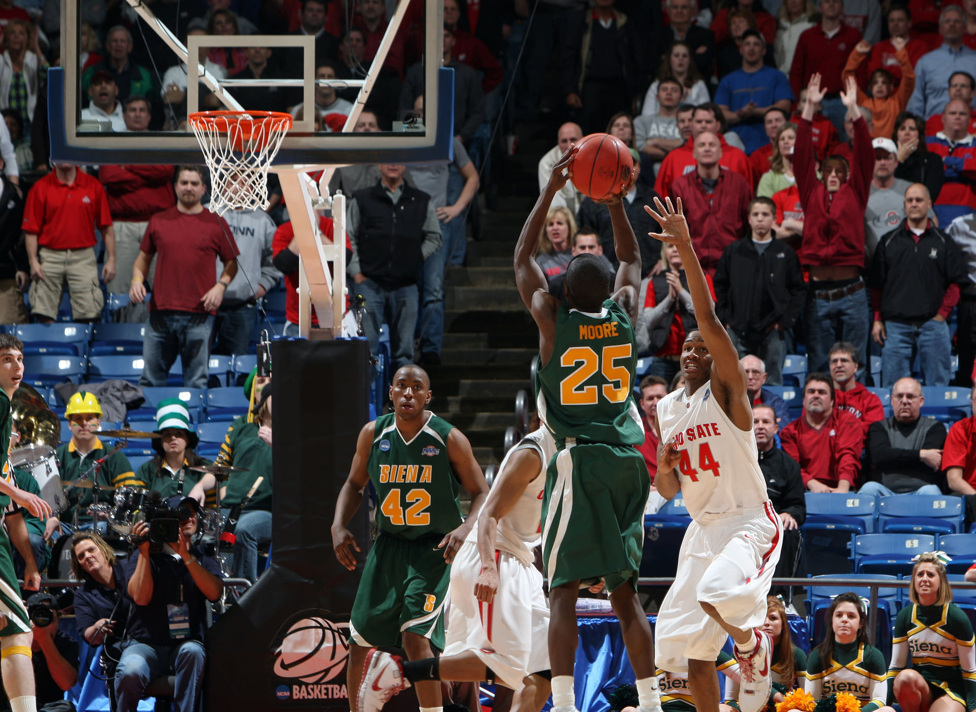 Moore's impact was monumental in one of these second round appearances. In 2009, Siena defeated Ohio State in double overtime in the first round. Moore made a 3-pointer to tie the game late in the first overtime and drained another 3 with 3.9 seconds left in the second overtime to secure the win.