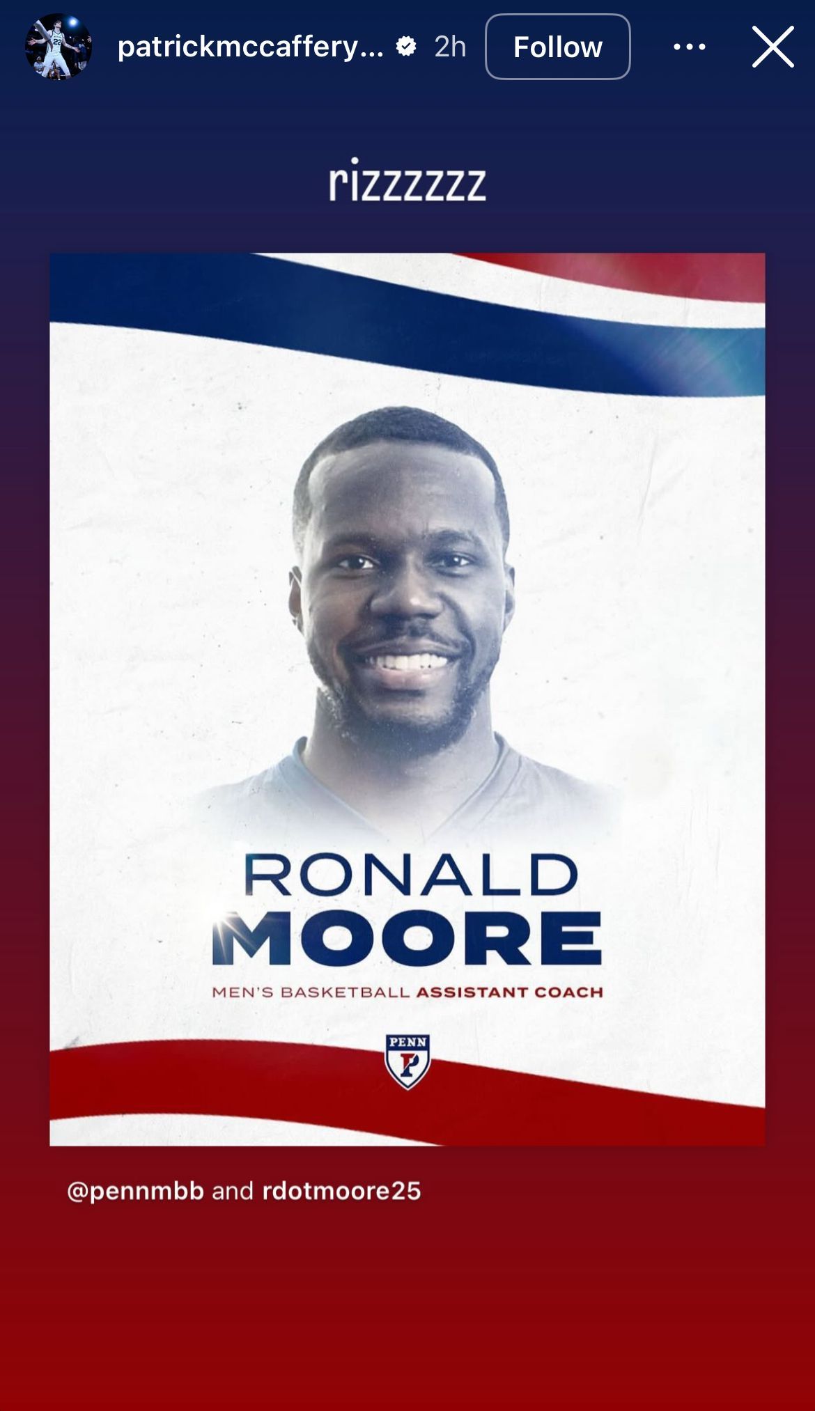 "I am excited for this opportunity, especially to do it alongside Coach McCaffery who has been such an integral figure in my own basketball career," Moore said. "I look forward to working with him and helping bring Penn Basketball back to its place as the flagship program in the Ivy League."