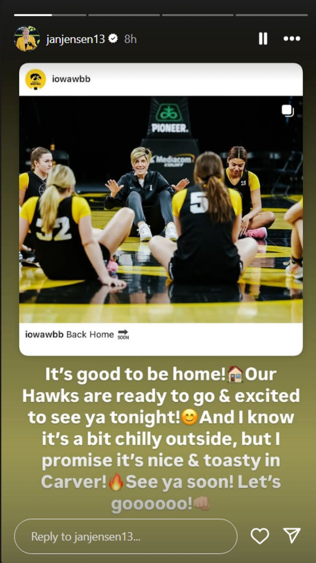 Jan Jensen had a message for Iowa fans and players before Thursday's game against Rutgers. The first-year head coach was filled with excitement about playing at home after back-to-back road games against Minnesota and Nebraska. She also promised fans that the Hawkeyes will be on their A-game despite the cold weather in Iowa City.