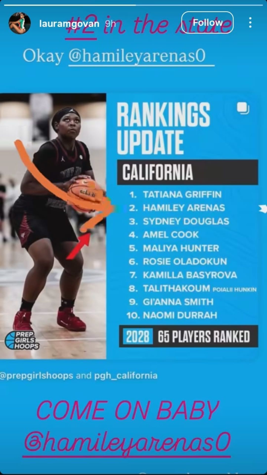 On Saturday, Govan reposted Prep Girls Hoops' post on her Instagram story, sharing the updated rankings of the California Class of 2028. Hamiley ranked second, just behind Tatiana Griffin, who is a member of the 2025 USA Women's U16 National Team.