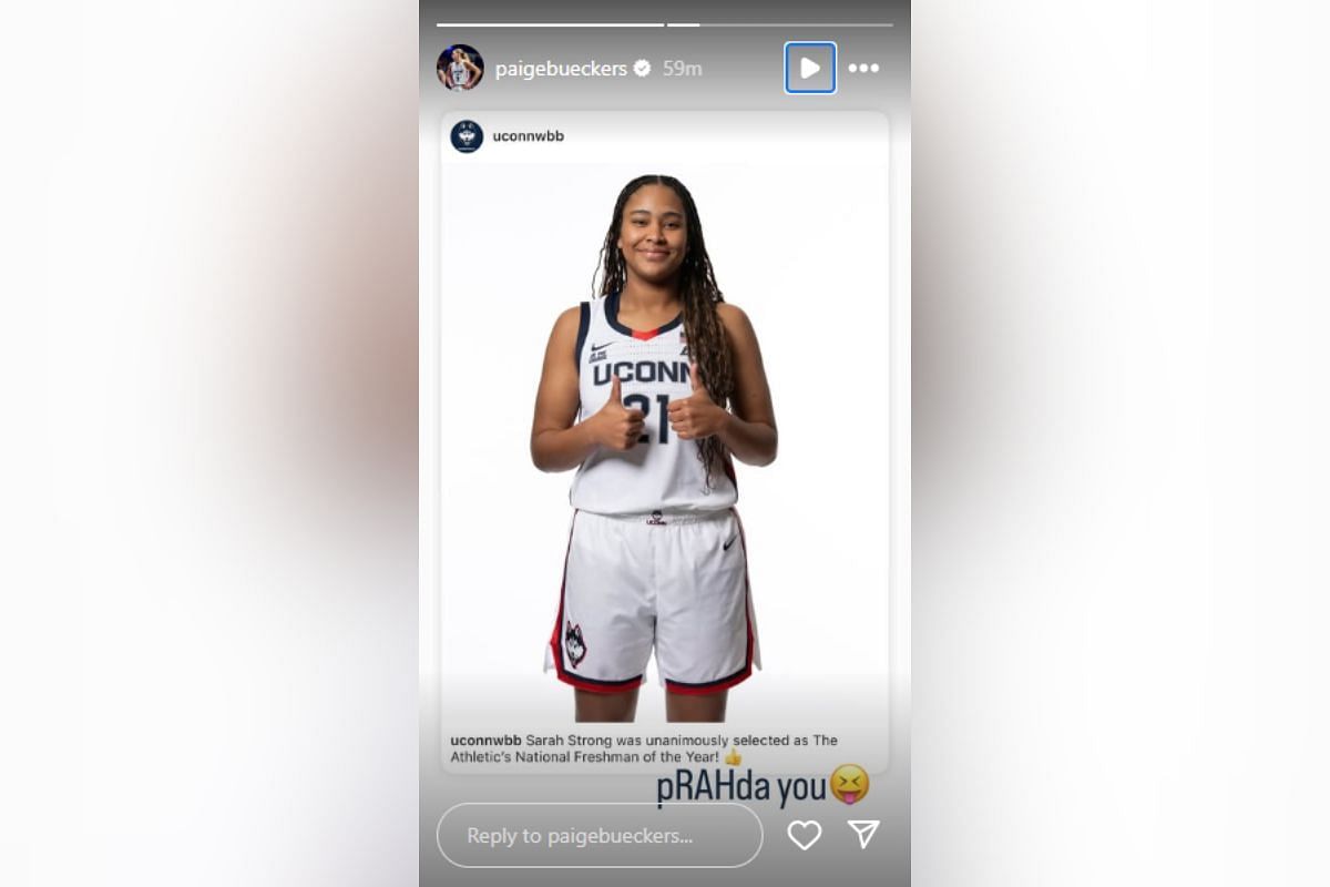 UConn star Paige Bueckers used cheeky wordplay to congratulate her teammate Sarah Strong who was named Freshman of the Year by The Athletic on Wednesday. Bueckers reposted Strong's achievement on her Instagram story and capitalized a few letters in her message in what appeared to be an inside joke.