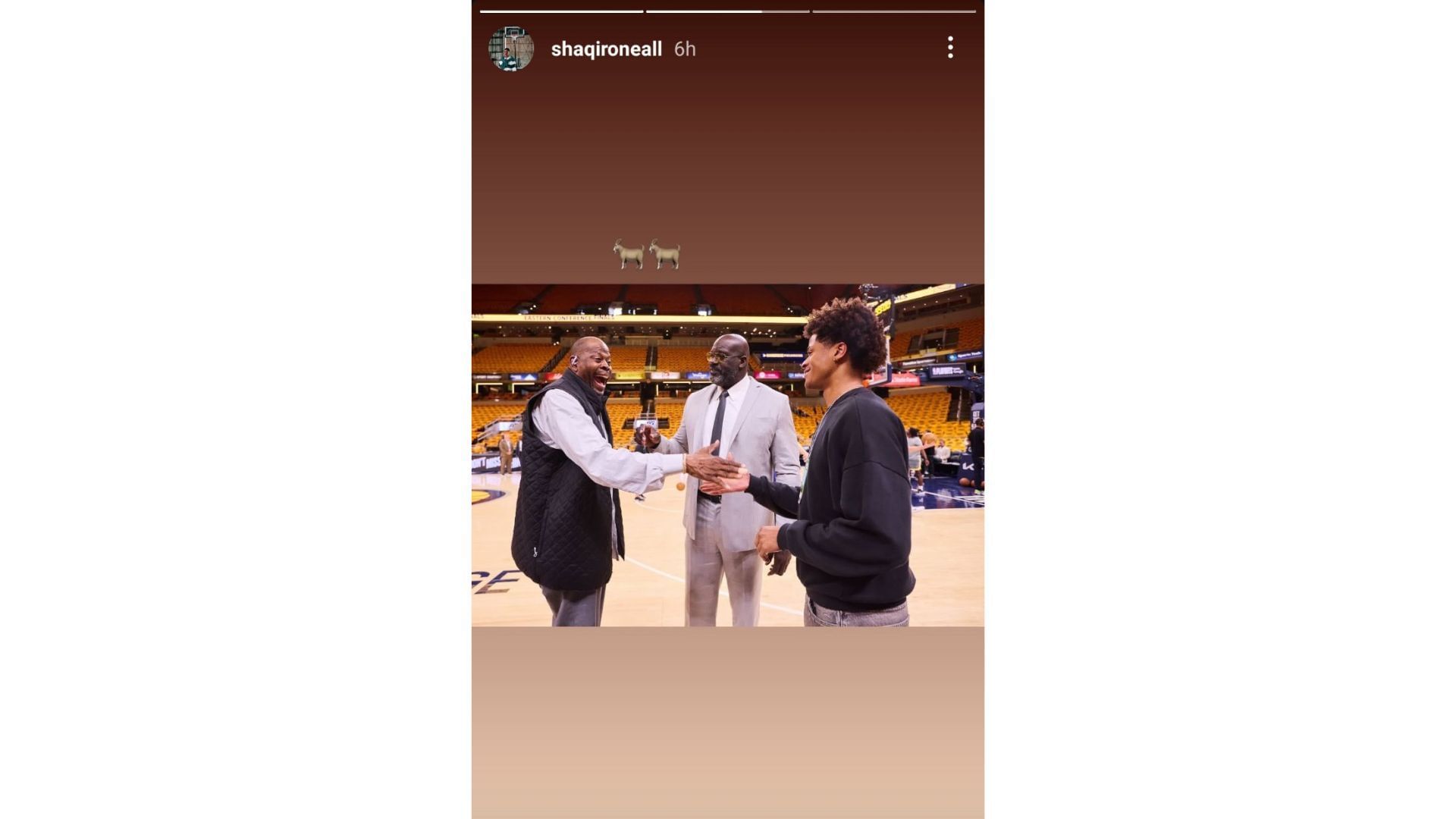 The younger O'Neal paid tribute to the NBA greats by placing two GOAT emojis on his Instagram story. Shaquille O'Neal and Patrick Ewing are two of the greatest centers in the NBA. Both are members of the Basketball Hall of Fame. They were also part of the NBA's 50 Greatest Players (1996) and the league's 75 Greatest Players (2021).