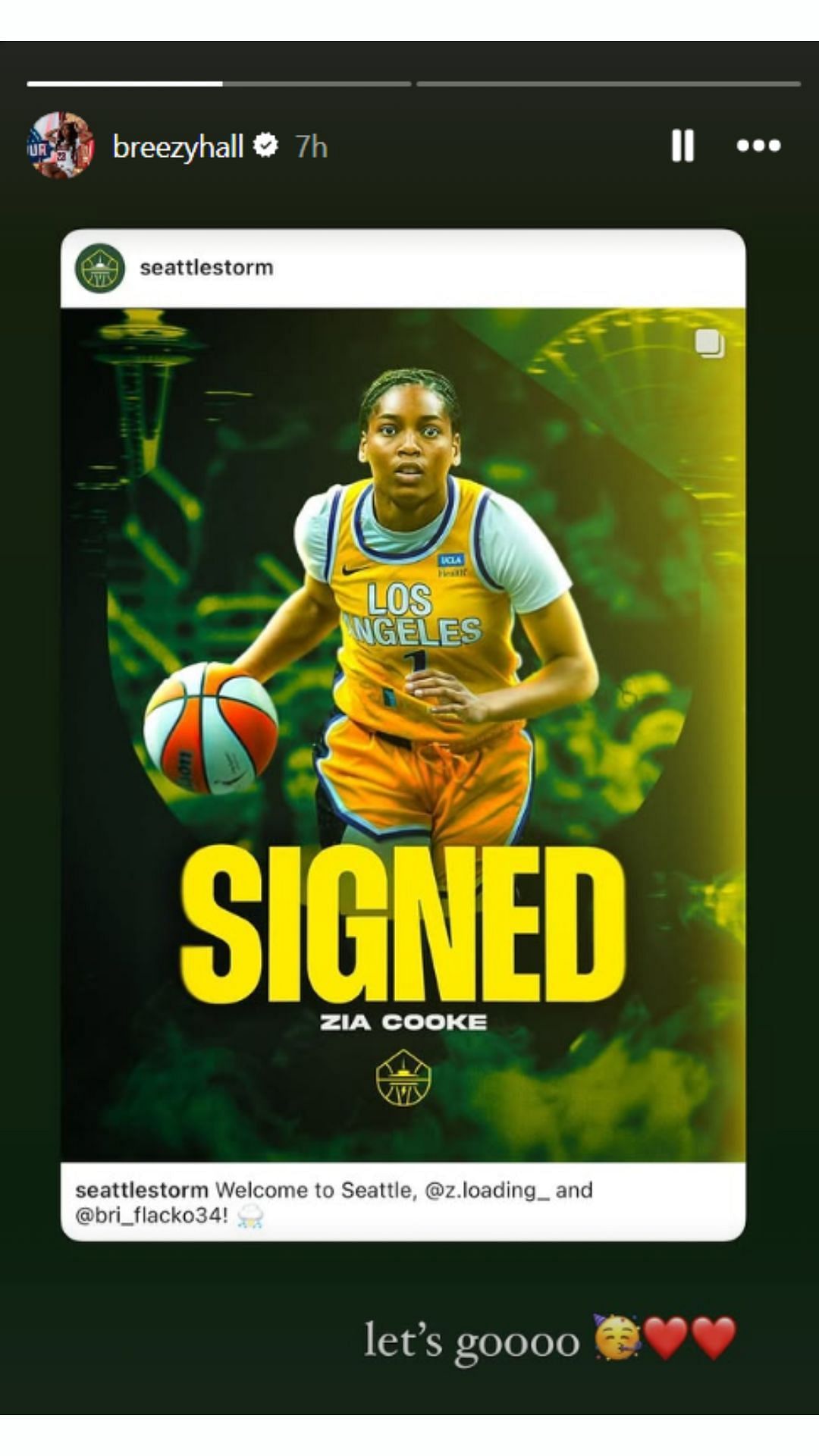 South Carolina's senior Bree Hall was hyped upon learning that former Gamecock Zia Cooke was signed by the Seattle Storm. As the WNBA franchise's IG update about Cooke's new journey, the guard reposted on her Instagram stories with a brief message: