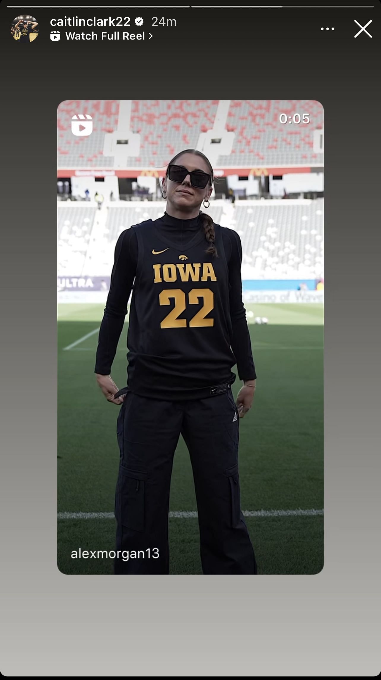 Morgan shared a video of herself in a Hawkeyes jersey on her Instagram page on Friday. The two-time World Cup winner had a Caitlin Clark numbered Iowa uniform on her all-black outfit inside a soccer stadium. The Iowa point guard subsequently reshared the video post on her Instagram story.