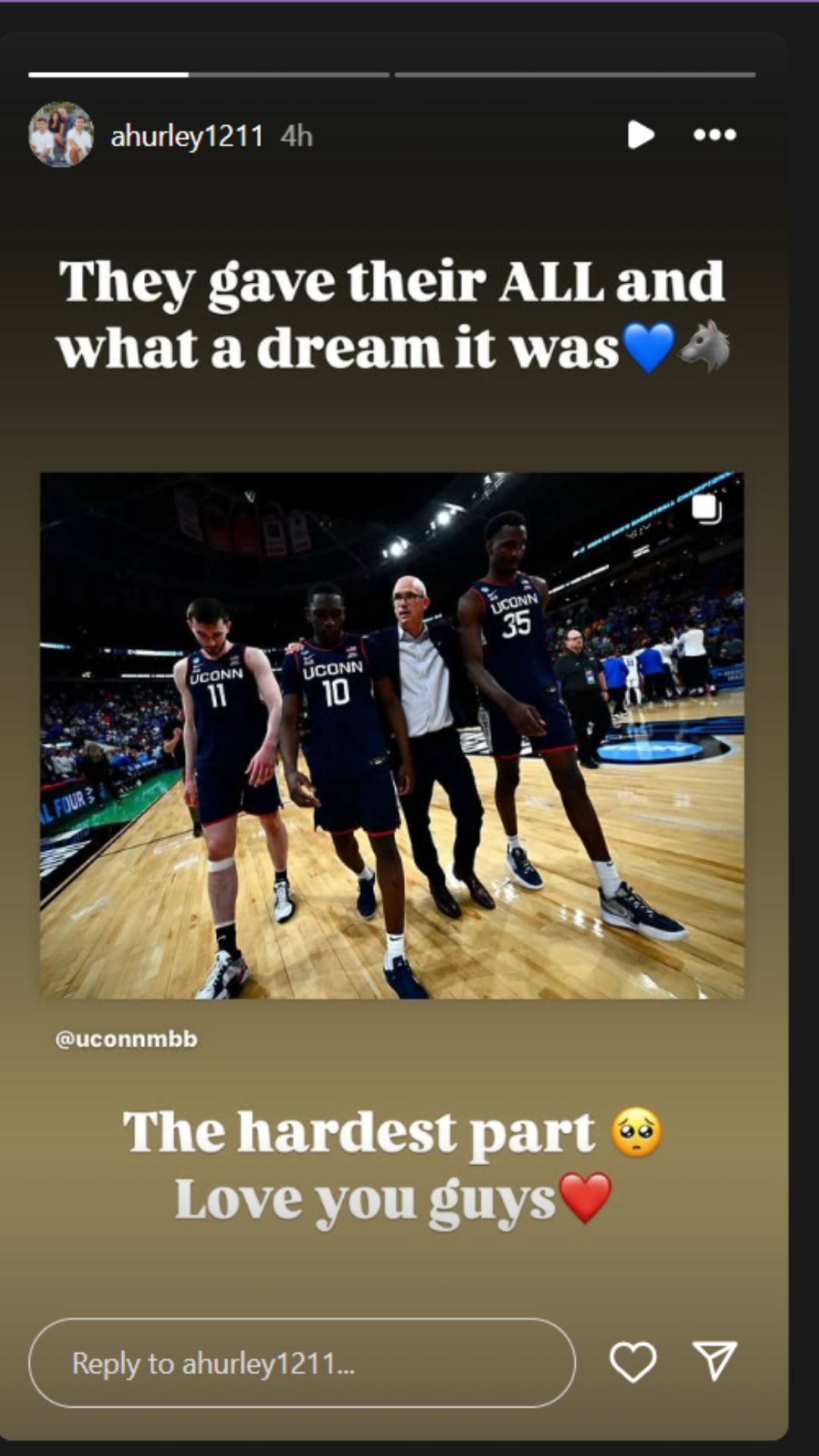 Following the game, Hurley's wife posted a photo of her husband with three UConn players on her Instagram story with the caption: