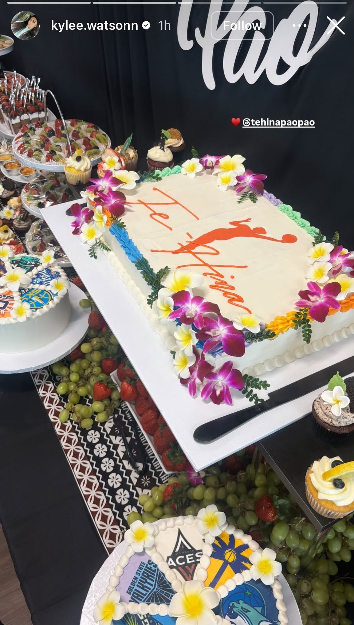 Watson also gave fans an inside look into Paopao's party, posting a picture of the dessert table. Desserts included fresh fruit, cupcakes, two small cakes with the logos of WNBA teams on them, and a large cake with a basketball player silhouette and "Te-Hina" printed on it.
