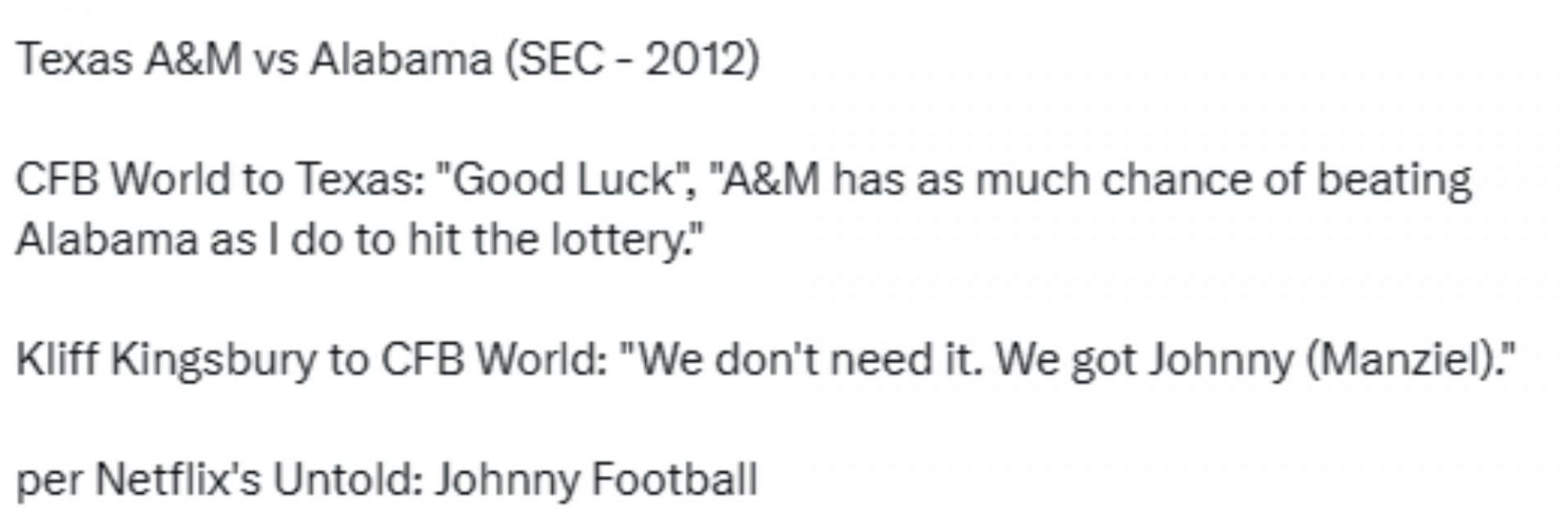 "A&M has as much chance of beating Alabama as I do to hit the lottery," CFB World to Texas, per Netflix's "Untold: Johnny Football."
