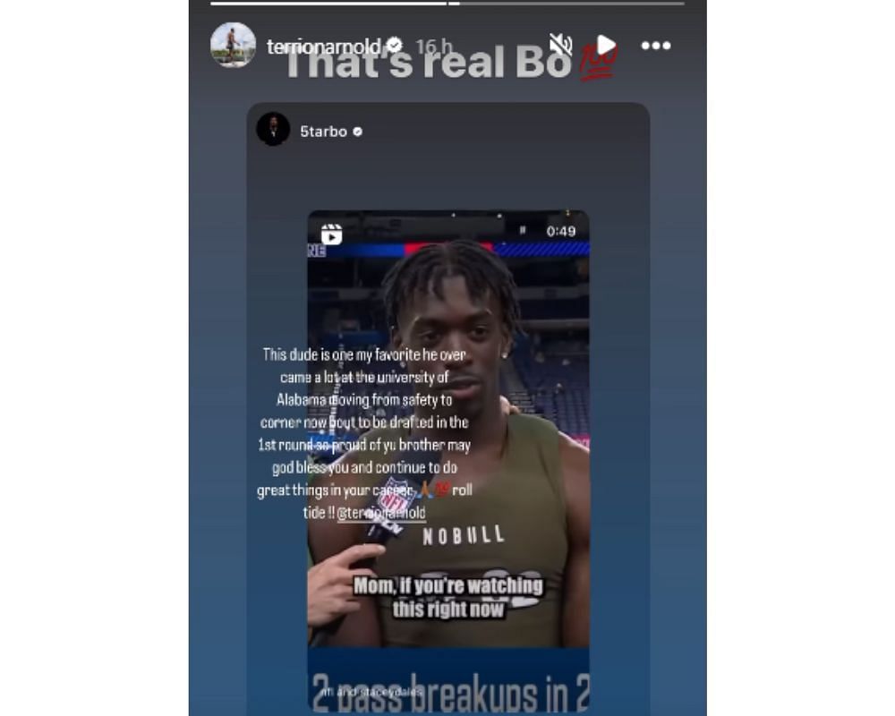Terrion Arnold has gained a lifelong fan in two-time national champion Bo Scarbrough with his on-field performances. Scarbrough, an Alabama alum and former NFL running back, won the national championship twice under Saban's guidance in 2015 and 2017.