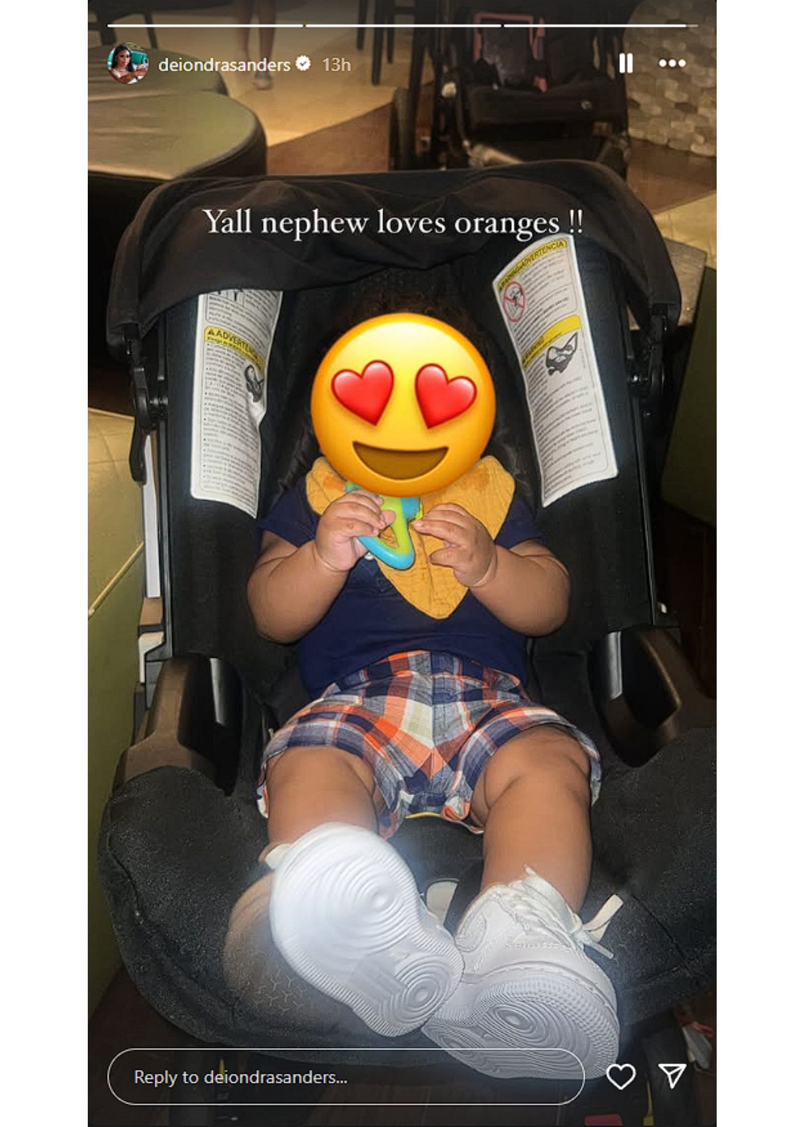 In a cute picture she posted to her story on Wednesday, Deiondra Sanders shows Baby Que in his carrier, dressed in a blue t-shirt, square shorts, and white shoes. She carefully covers the baby's face with emojis to protect his privacy. He also seems to have what looks like an orange bib. In a message that seems aimed at her siblings, Deiondra Sanders wrote about Coach Prime's grandson's dietary preferences: