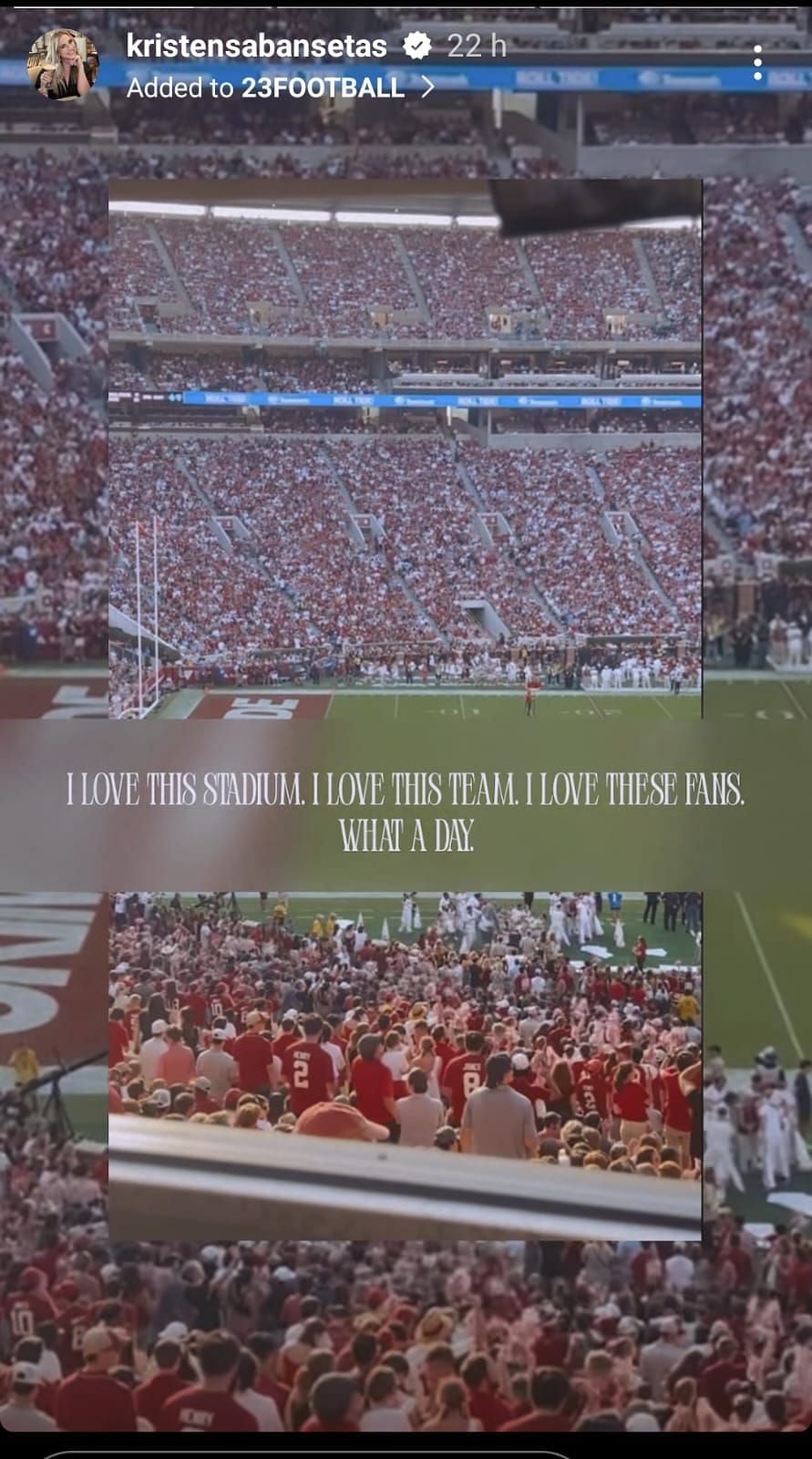 Saban's daughter Kristen Saban loved how pumped up the stadium was for the Week 4 clash. Even though Alabama looked a little rough in the beginning, the fans stood right behind them until they picked up their game in the second half.