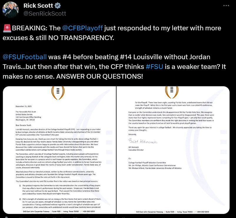 In a letter addressed to committee chairman Boo Corrigan, Senator Scott sought transparency. He demanded an answer to the question of why a perfect 13-0 record and an ACC Championship weren't enough for FSU to secure a coveted playoff spot.