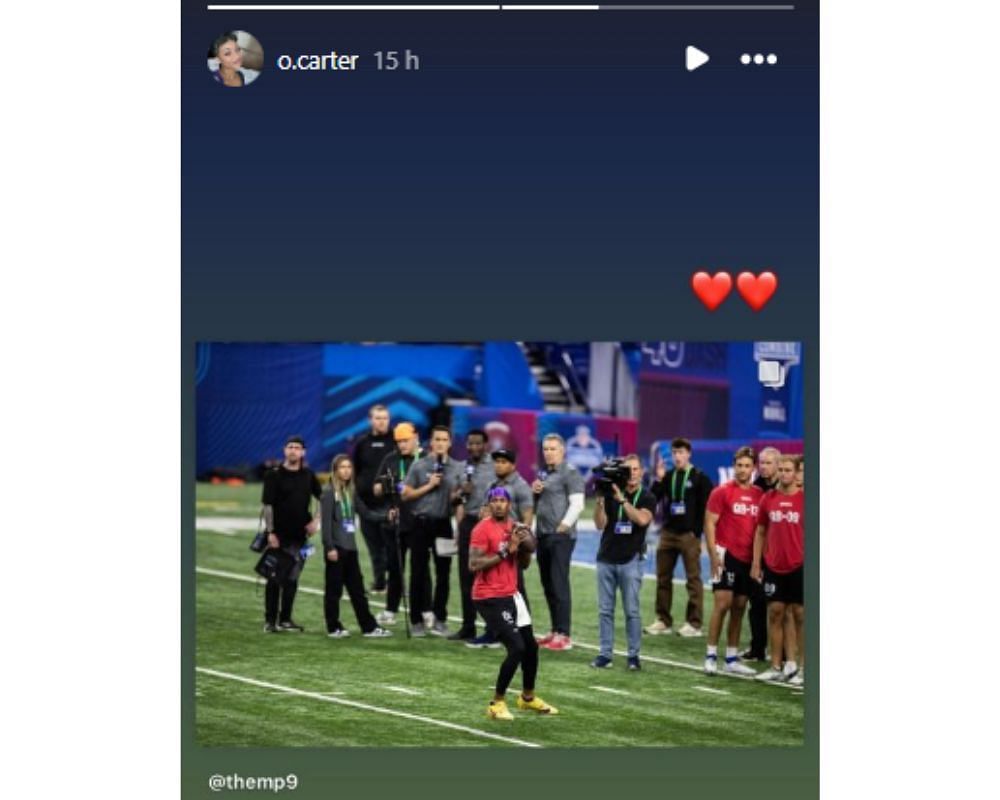 The girlfriend of Michael Penix Jr., Olivia Carter, proudly supported the former Washington quarterback's performance at the 2024 NFL Combine. Carter took to her Instagram story, posting a photo of Penix and cherishing the former Huskies signal caller.