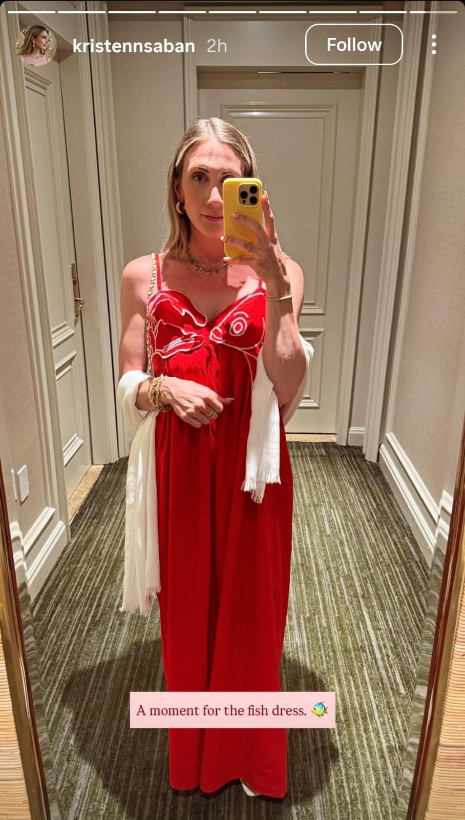In the story, we see Kristen Saban posing in front of a mirror. She flaunted a red dress along with a while shawl over her elbows. She accompanied the snippet with a caption that read: