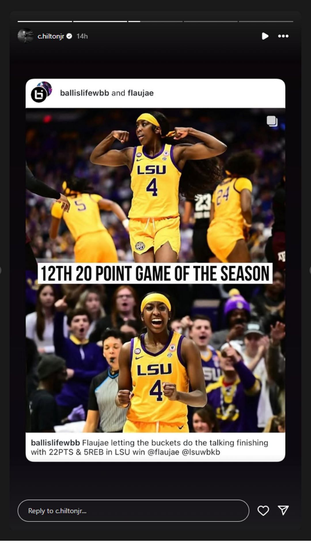 LSU star Flau'jae Johnson had a stellar game against Texas A&M on Sunday, pouring in 22 points. Following the 64-51 win at PMAC, Johnson shared a picture on Instagram story with her boyfriend, Chris Hilton Jr., who plays as a wide receiver for the LSU football team.