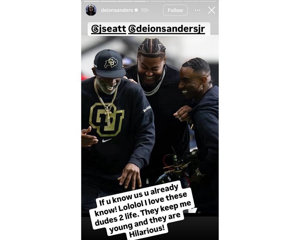 On Monday, Deion Sanders gave a shoutout to his son, Deion Sanders Jr., and Colorado Buffaloes starting left tackle Jordan Seaton on his Instagram. Coach Prime shared a photo of himself, his son, and Seaton seemingly fooling around and joking with one another at the Colorado Buffaloes facility.