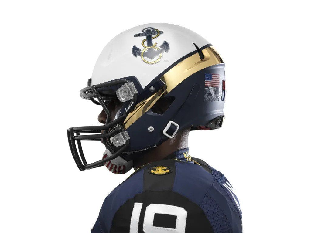 Anchors Aweigh! A beautiful tribute to the storied and proud service to which Annapolis belongs. With the rank insignia for Midshipmen on the shoulders and a detailed anchor drawing on the helmet, this is a uniform Robert Staubach and Admiral Nimitz alike would have been proud of.