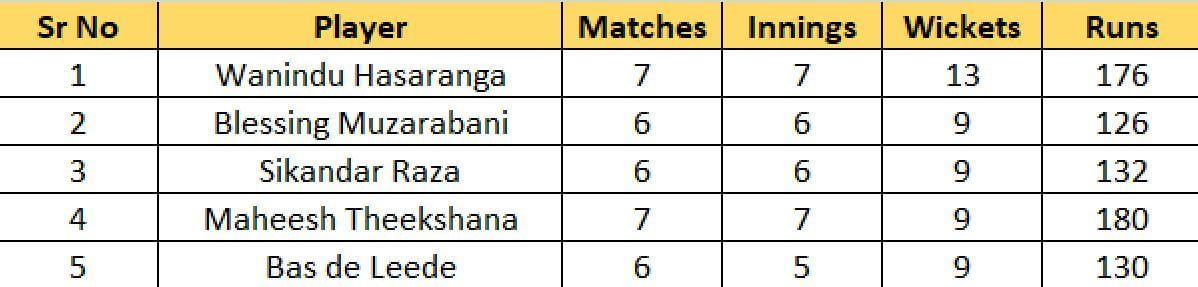 Blessing Muzarabani of Zimbabwe is placed second in the list of most wickets taken. The right-arm pacer has grabbed nine wickets in six games at an average of 14 with the ball. He is troubling the opposition batters upfront and will look to add a few more when he takes the field next time.