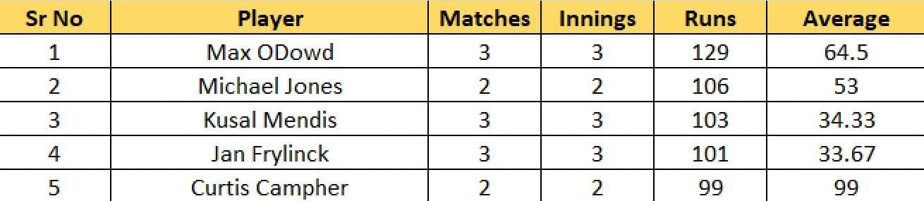 Max O'Dowd of the Netherlands continues to lead the charts. He has scored 129 runs in three games so far and is the current leading run-scorer of the ICC Men’s T20 World Cup 2022.