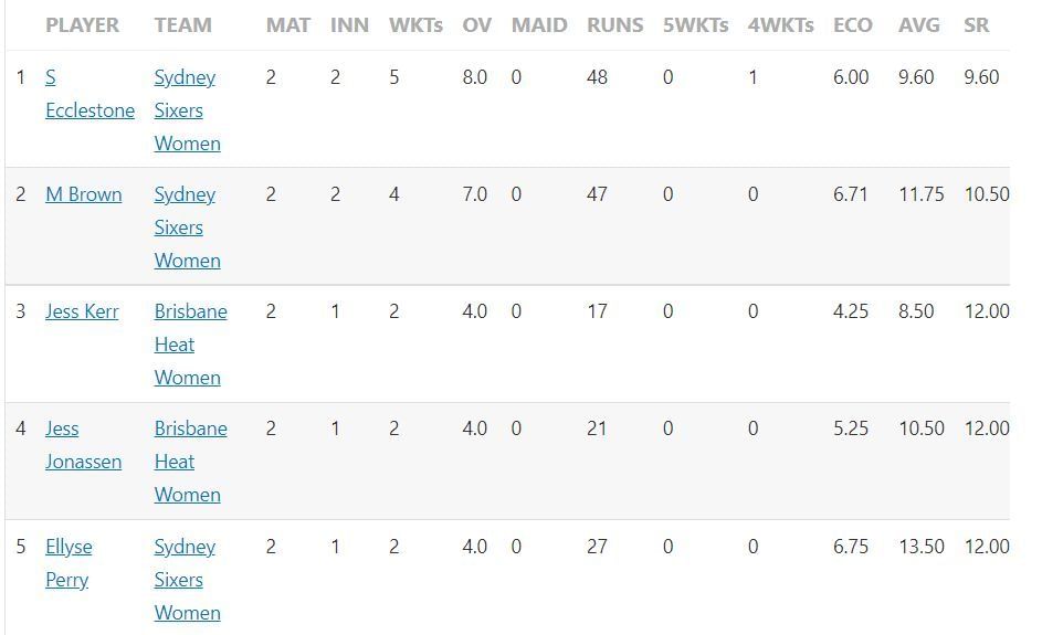 Maitlan Brown of Sydney Sixers is below her teammate Ecclestone. She picked up three wickets in her first game against Brisbane Heat and followed up by picking one against the Strikers. She now has four wickets.