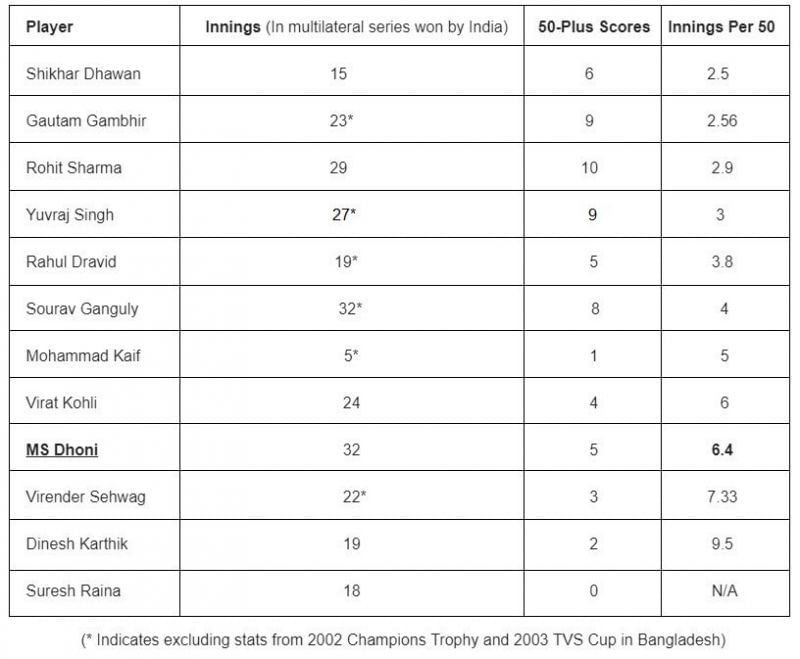 You can clearly see that MS Dhoni is ninth on the list and only scores a fifty in no less than six innings when India wins multilateral tournaments. He usually prefers to stay in the background.