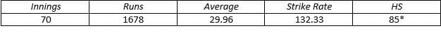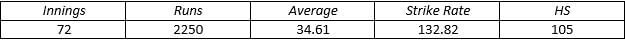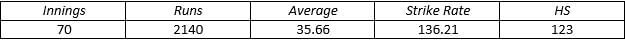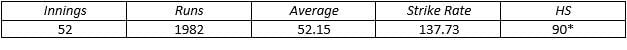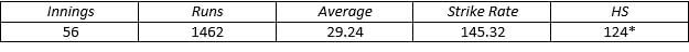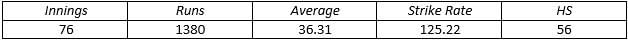 The 31-year-old's reputation in T20Is is evident enough from his seven man-of-the-match performances and a player of the series award. He also has 102 sixes to his name, one short of the Chris Gayle's 103, which is the most in T20I's.