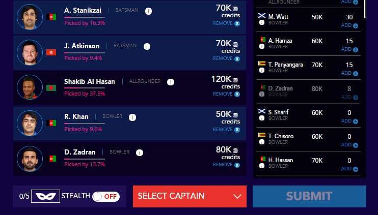 With Mohammad Shahzad and Dawlat Zadran already in my team, my interests lie in Asghar Stanikzai, Mohammad Nabi, Rashid Khan, and Jamie Atkinson.