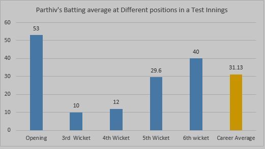 Parthiv moved down the order for the 4th Test of the series but returned to the top for the 5th Test after Murali Vijay injured himself. Opening was always going to be a stiff task as he had kept wickets for 157 overs spanning a little over 5 sessions prior to that.