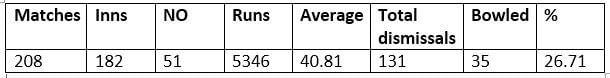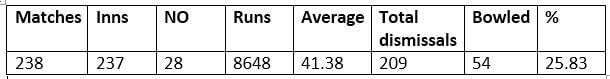 He was dismissed 209 times in the 50-over format with 54 of them being bowled - a percentage of 25.83.