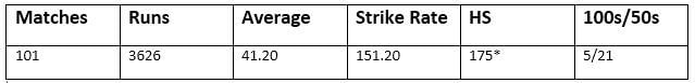 With 3626 runs from 101 IPL matches, including five centuries, at an average of 41.20 and a strike rate in excess of 150, Chris Gayle is an IPL legend in his own right and the second-highest run-getter in terms of overseas players in the history of the competition.