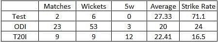The rising start of Indian cricket has gone from strength to strength since and has become a permanent fixture in the Indian limited overs side. He possesses excellent variations and can beat the batsmen in the air. In his very short career so far, he has already picked up 33 international wickets.