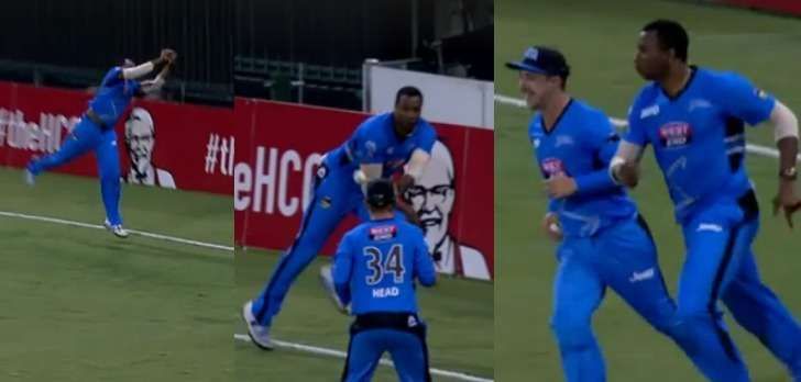 While the official scorecard of the match between the Adelaide Strikers and Brisbane Heat played in 2015 may show this incredible catch under Travis Head’s name, it was Kieron Pollard who carried out the effort almost single-handedly. In fact, Head’s role in taking it was restricted to being in the right place at the right time.