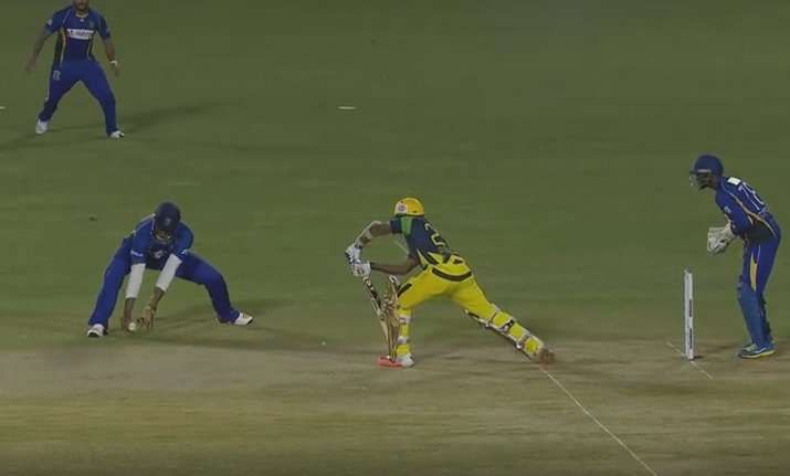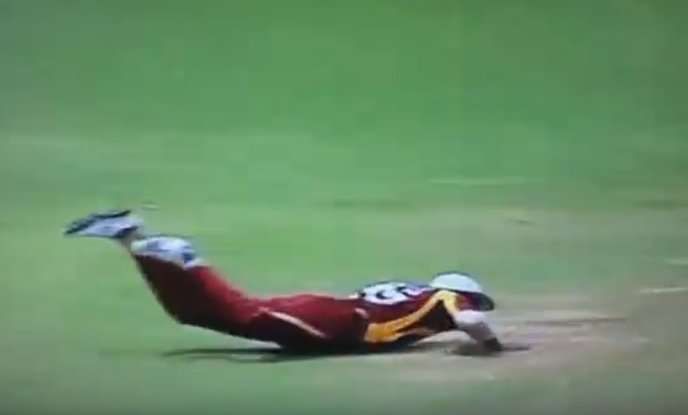 Part-timer Marlon Samuels bowled a slightly shorter delivery and Warner, who was on 40 at the time, punched it towards the cover region. The ball flew towards Pollard’s extreme left and he dived full length to get to it, plucking it just inches off the ground in a spectacular effort.