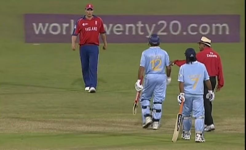 As India batted first and looked set to put up a big score, a frustrated Andrew Flintoff started having a go at Yuvraj Singh. As it often happens, things got a bit ugly between the two and the umpires had to intervene to calm down the situation.