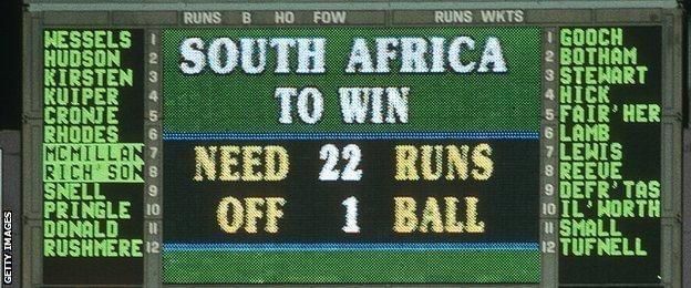 This led to South Africa needing an impossible 21 to win off 1 ball. There was confusion and anger among the fans as the scorecard incorrectly displayed 22 off 7 balls and was quickly changed to 22 off 1 ball, and finally 21 off 1 ball. In the end, Brian McMillan just took a single off the last ball and walked off furiously to the pavilion.