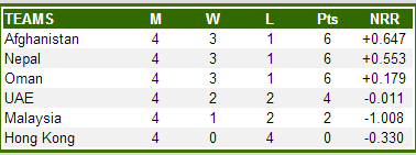 With one more match to go, Afghanistan and Nepal occupy the first two spots respectively, and they are scheduled to play the last match of the tournament.