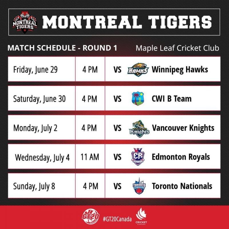 The following is the team schedule for Montreal Tigers in the Global T20 Canada 2018: