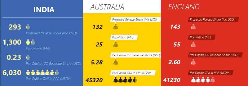 As illustrated in the below infographic, India’s per capita revenue share (ICC Revenue per Indian) is the lowest among the big three cricketing nations by far. This means, if the shared revenue amount is to be distributed among all Indians equally, it drips down to a negligible amount for their cricketing development. Incidentally, India also has way too low per capita GNI (Gross National Income) compared to its developed counterparts.