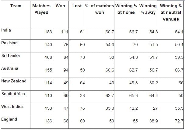 The above table shows the statistics of the top 8 nations in ODIs from 01 May 2007 till 26 Jul 13. Apart from the usual parameters like matches played, matches won and lost and percentage of matches won overall, it also shows the percentage of matches won at home, away and neutral venues.