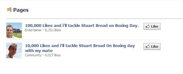 A few new Facebook pages have been created which call for ‘likes’ and promise to tackle Stuart Broad on the Boxing Day! The 4th Test of the ongoing Ashes commences on the Boxing Day (26th December) at Melbourne Cricket Ground, and the owners of these pages have made a promise to tackle Broad at MCG if their pages reach a minimum number of ‘likes’.