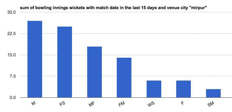 We decided to find the exact numbers to support the cases. We first found out the total wickets taken in last 15 days at Mirpur by different bowling style. Here is the graph depicting it.