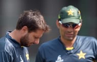 Pakistani captain Misbah-ul-Haq (R) talks with teammate Shahid Afridi during a practice session ahead of the final of the Asia Cup one-day cricket tournament between Pakistan and Sri Lanka at the Sher-e-Bangla National Cricket Stadium in Dhaka on March 7, 2014.