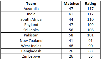 With the 3rd ODI in New Zealand ending in a tie, this win puts Australia and India both at 117 points, but with Australia nudging ahead when decimal points are taken into consideration.