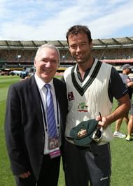 Rob Quiney of Australia receives his baggy green from Allan Border during day one of the First Test match between Australia and South Africa at The Gabba on November 9, 2012