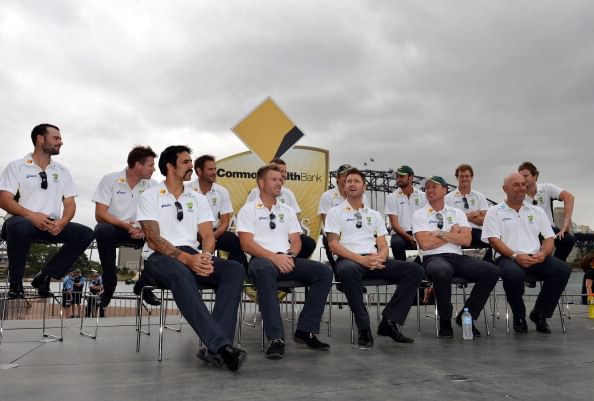Johnson, Warner, Clarke, Haddin, team coach Lehmann, Doolan, Faulkner, Harris, Siddle, Shane Watson, Lyon, Bailey and Steven Smith sit on a stage during a ceremony to celebrate Ashes Test series victory against England .