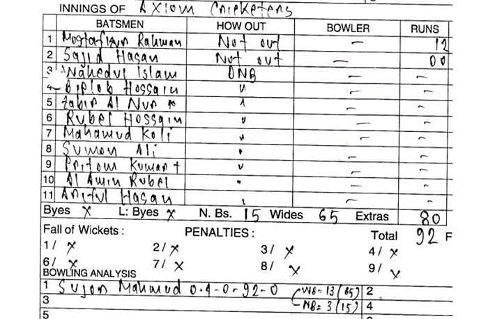 In the first over of the game, defending 88, he bowled just 4 legal deliveries, along with 13 wides that resulted in 65 runs and 3 no-balls that resulted in 15 runs. In the 4 deliveries that were deemed legitimate, Axiom batsman Rahman scored the remaining 12 runs.