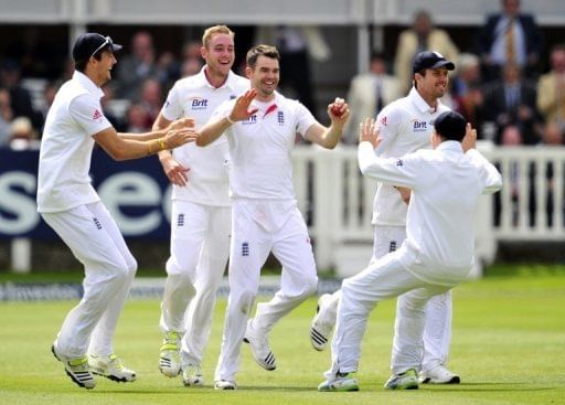 (L-R) England’s Steven Finn, Stuart Broad, James Anderson, Nick Compton and Joe Root (facing away) celebrate winning the first Test against New Zealand by 170 runs at Lord’s in north-west London on May 19, 2013. England on Tuesday named an unchanged squad for the second Test against New Zealand at Headlingley, after batsman Ian Bell and spin bowler Graeme Swann both overcame illness.