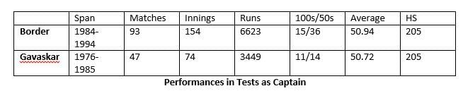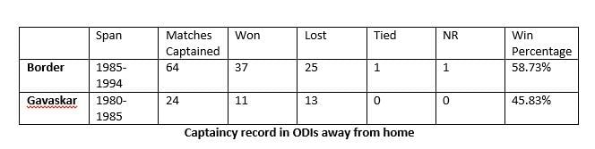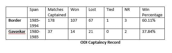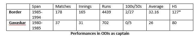 In ODIs, Border has a pretty impressive record as captain with 4439 runs at an average of 32.16 while Gavaskar scored just 702 runs in 37 matches at an average of 26.