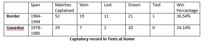 Allan Border and Sunil Gavaskar are both terrific cricketers with quite different styles of captaincy. Gavaskar adopted a pretty conservative technique which helped India stay unbeaten in a number of matches but could not fetch many victories.