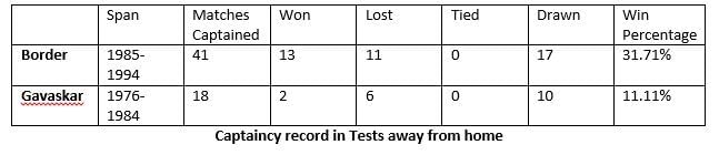 To make the comparison a little fairer, I have also taken into consideration Border’s record for his first 18 Tests outside Australia as captain and he still edges out Gavaskar with a win percentage of 22.22%, having led Australia to a win 4 times.