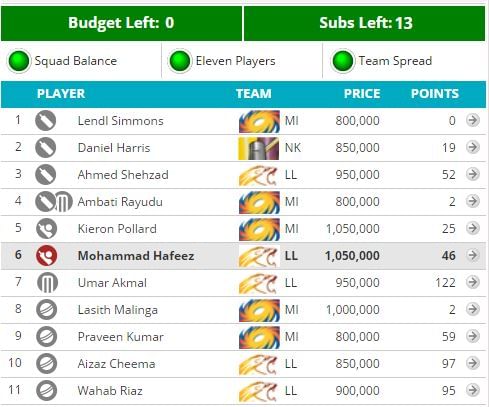 You would be able to observe a few changes to my team as compared to the one in the previous article, courtesy the shortened first fixture. I didn’t want to waste my spots on a 10-over-a-side fixture for obvious reasons; as a result, the likes of Jehan Mubarak, Sachith Pathirana, Trent Boult and Kane Williamson made their way out, paving way for Ahmed Shehzad, Wahab Riaz, Ambati Rayudu, and Kieron Pollard to come in. It sort of cancelled out, you can say. But, this way, I had improved the likelihood of my players succeeding.